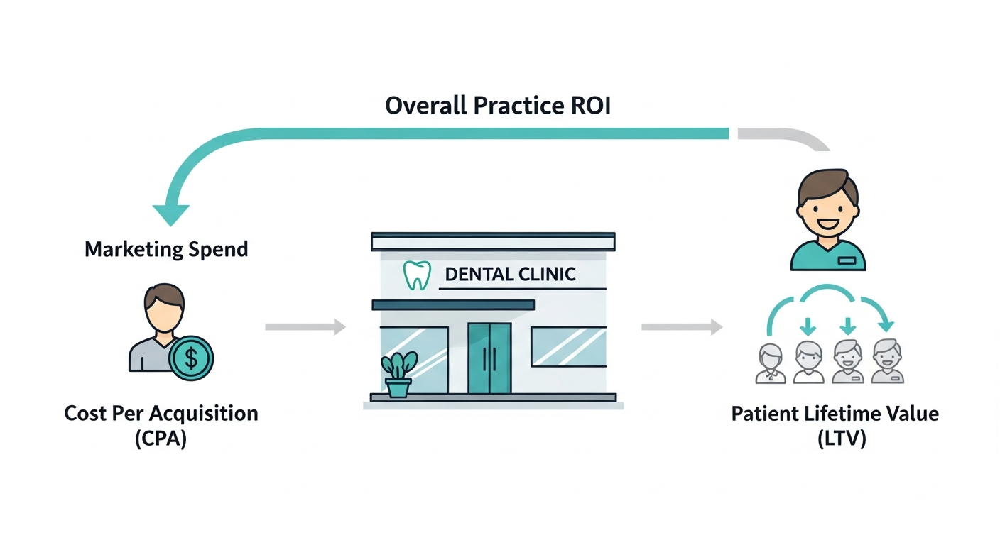 A holistic view of dental ROI connects the cost of acquiring a new patient (CPA) with the long-term revenue that patient generates (LTV).
