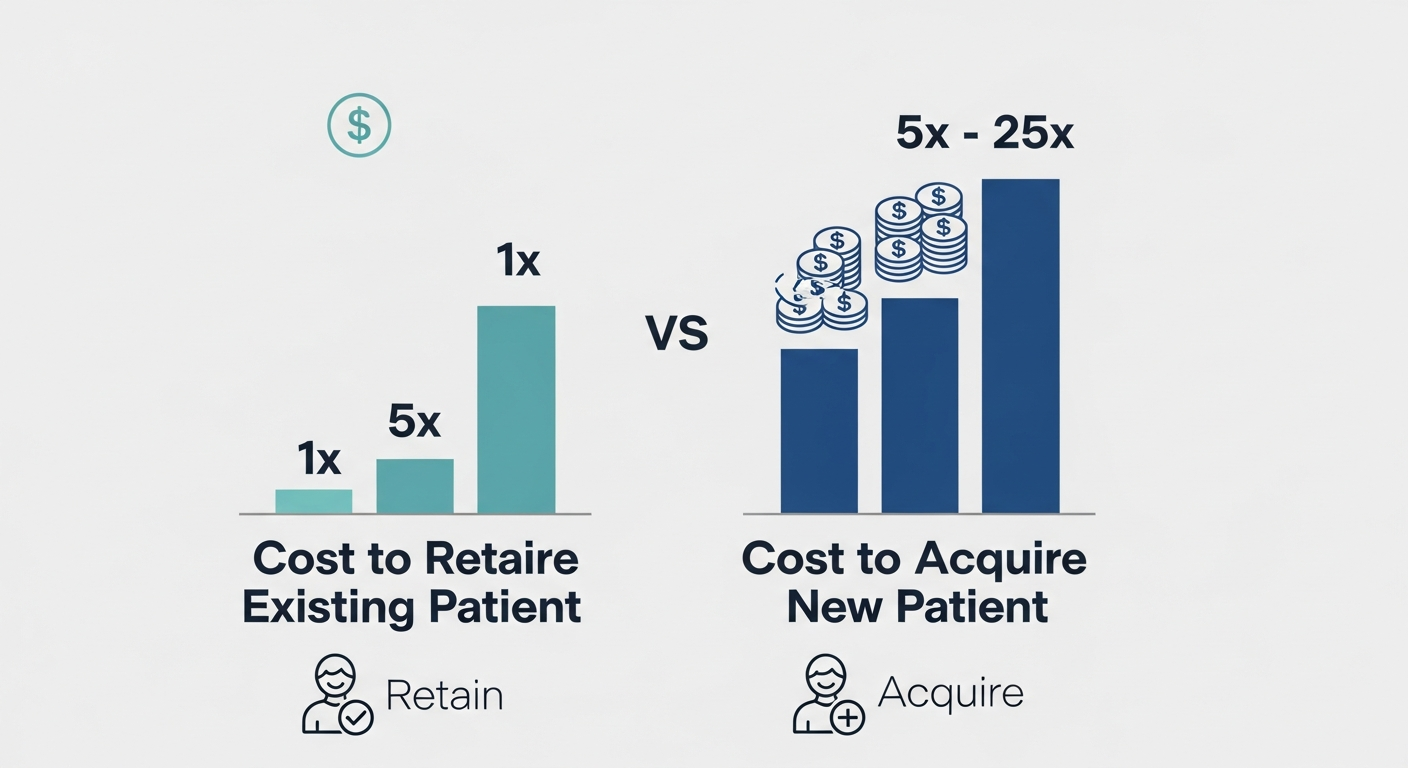 Acquiring a new patient can cost 5 to 25 times more than keeping an existing one, highlighting the financial power of a strong recall and retention strategy.