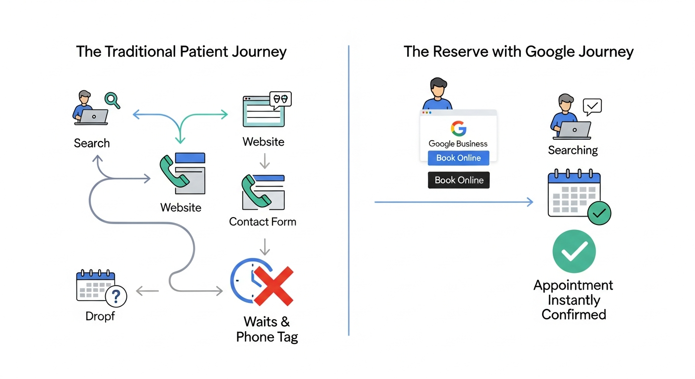 The patient journey is dramatically simplified with Reserve with Google, removing friction points that cause potential patients to drop off.