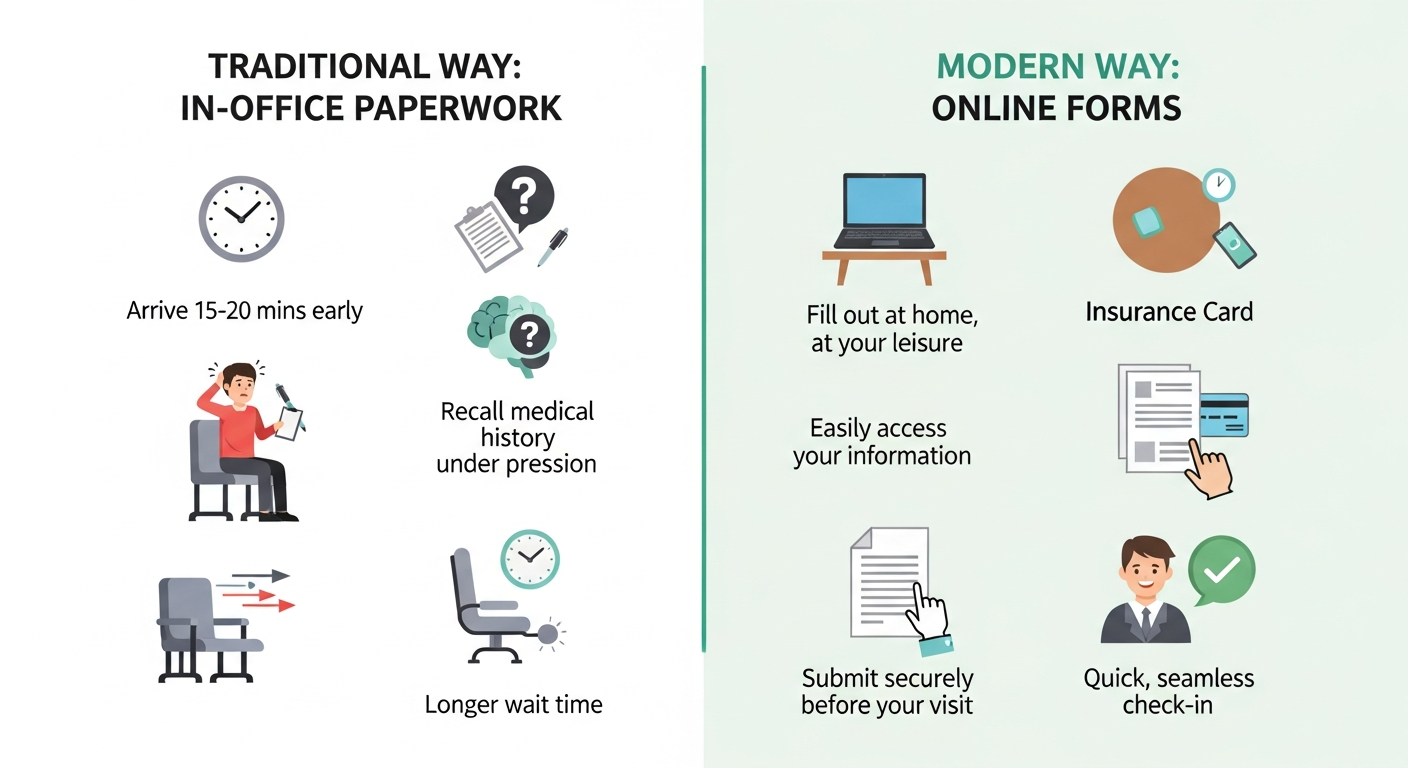 The patient journey: Completing forms online streamlines your visit compared to traditional in-office paperwork.