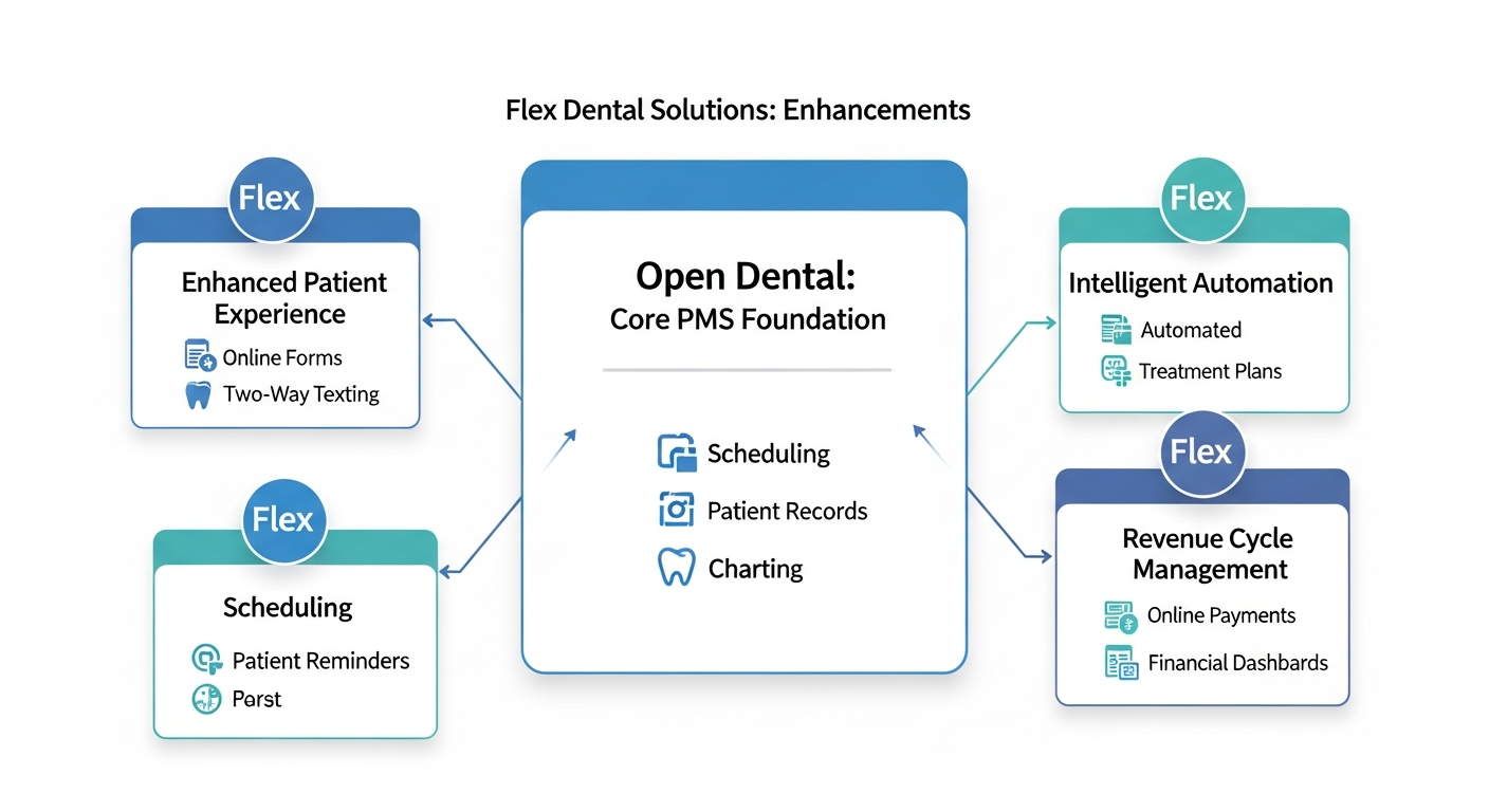 Flex Dental Solutions acts as an enhancement layer, integrating seamlessly with Open Dental's core foundation to add specialized capabilities.