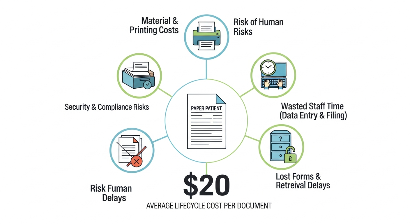 The reliance on paper forms, while seemingly straightforward, carries substantial hidden costs and inherent inefficiencies. Beyond the recurring expenses of paper, ink, printers, and physical storage solutions, paper systems are prone to errors, delays, and security risks. Manual data entry from paper forms into practice management software, like Open Dental, is time-consuming and introduces the possibility of typos and inaccuracies. Lost or misplaced forms can lead to incomplete patient histories, compromised treatment plans, and frustrating administrative bottlenecks. Furthermore, the environmental impact of excessive paper consumption is a growing concern for many practices and their patient base. The tangible costs are significant; in fact, healthcare organizations spend an average of $20 per paper document when accounting for printing, storage, distribution, and retrieval costs National Institutes of Health database via DoctorConnect.net, 2025.