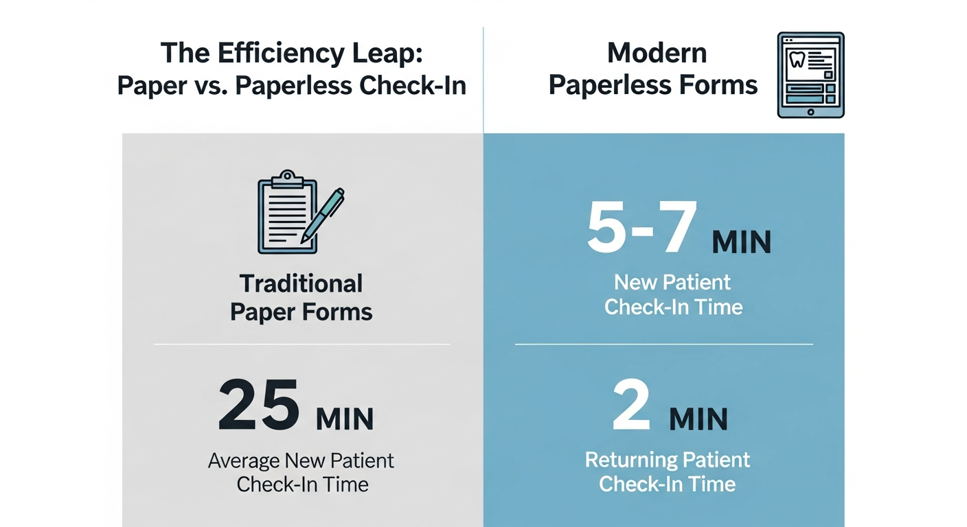Paperless forms can reduce new patient check-in times by over 75%, transforming the front-desk workflow.