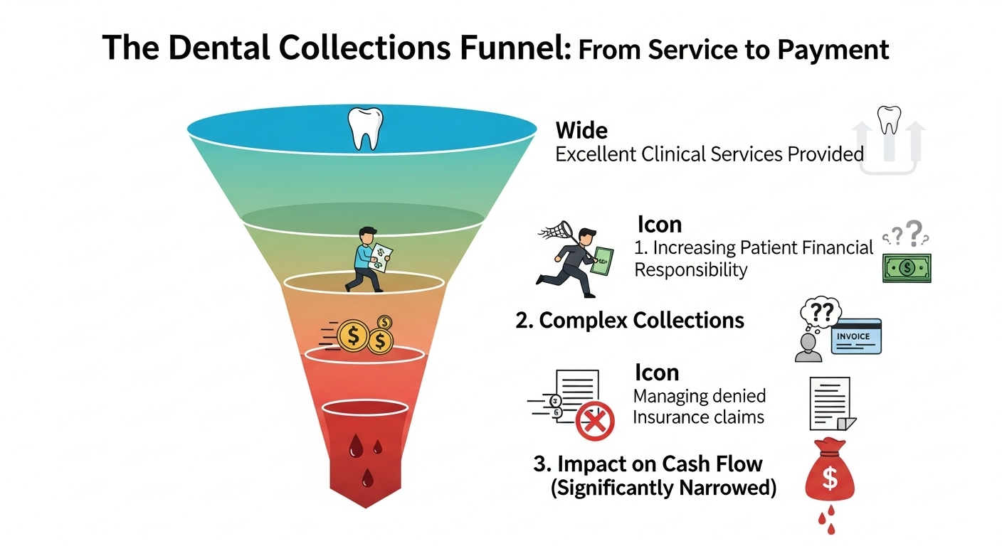 The Dental Collections Funnel illustrates how challenges in the payment process restrict cash flow for dental practices.