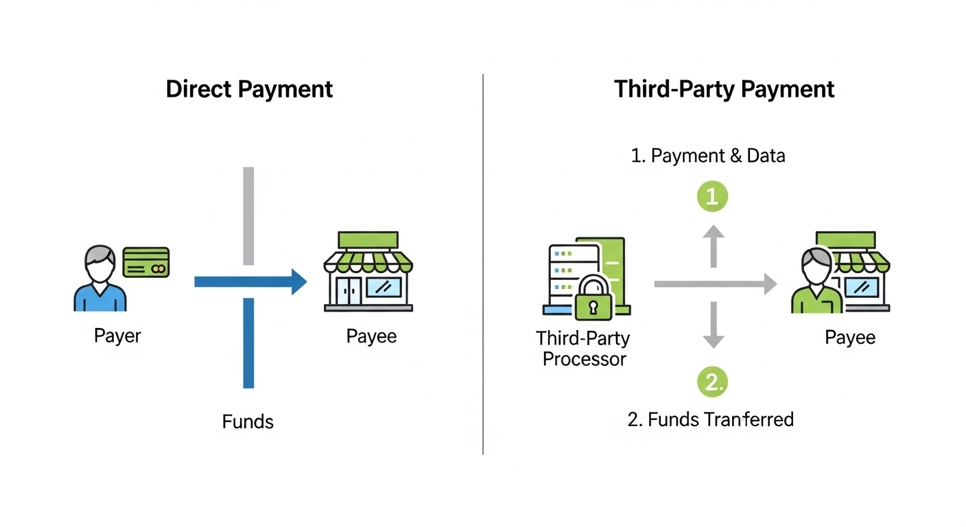 A third-party payment introduces an intermediary, unlike a direct payment where funds flow straight from payer to payee.